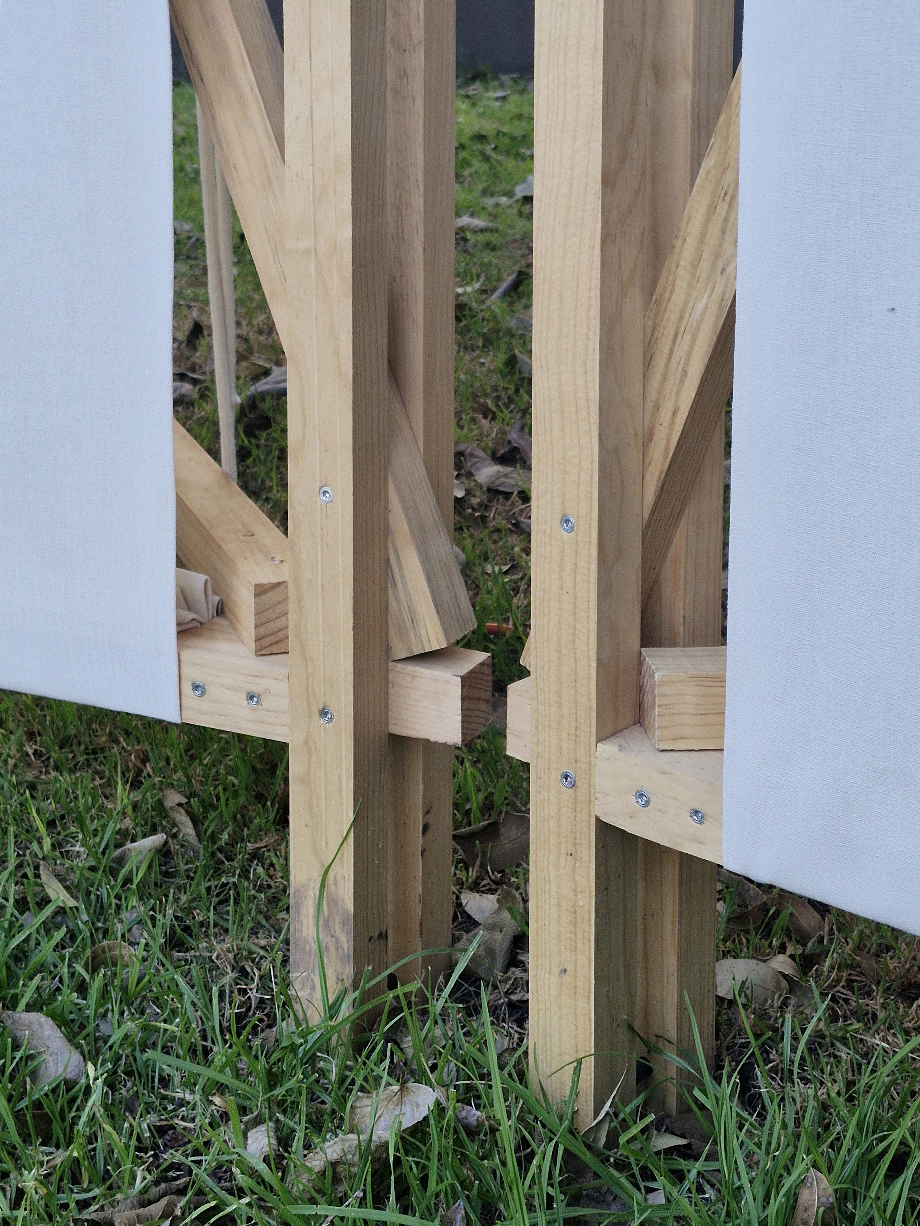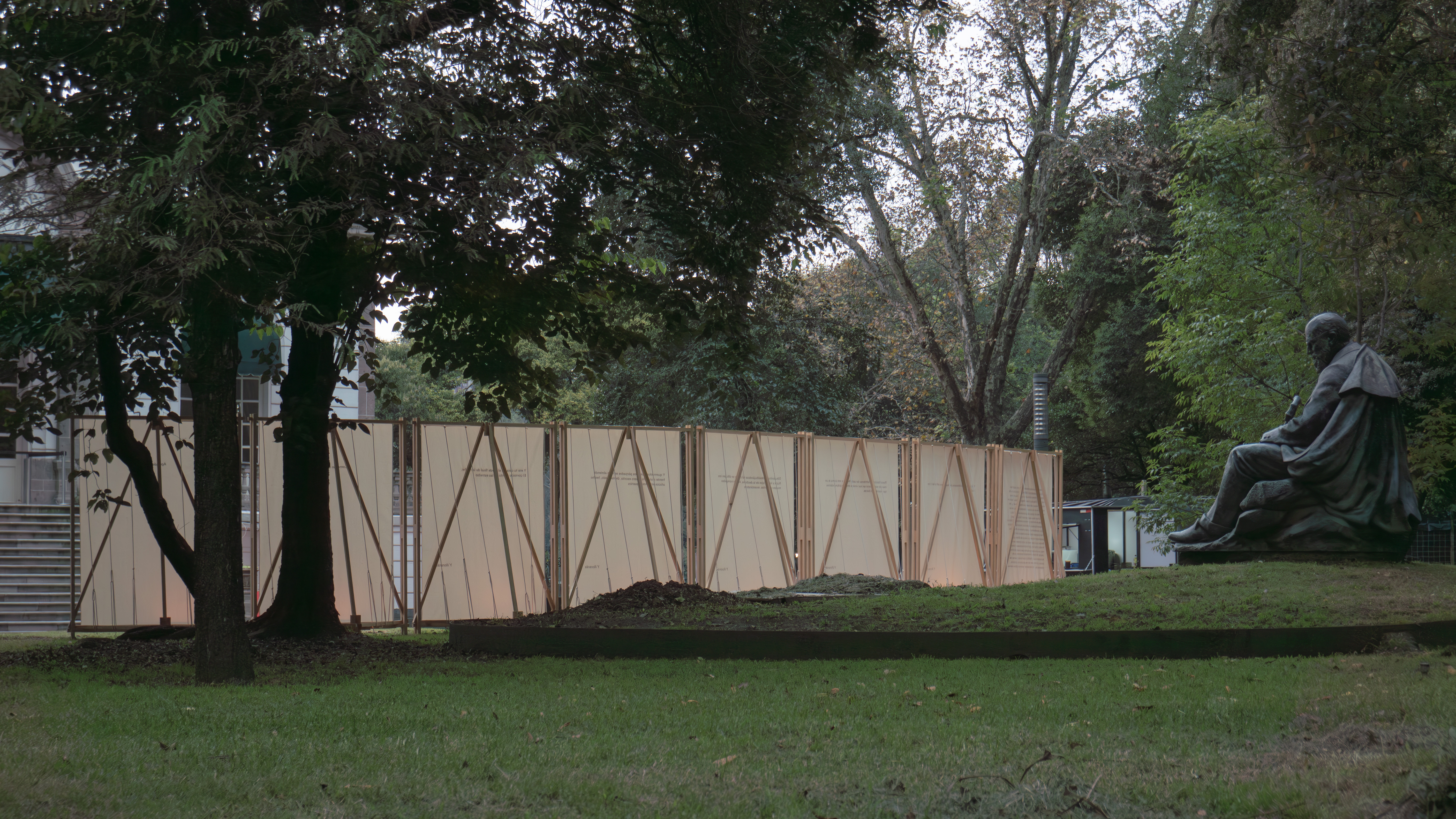 La pieza fue diseñada como una intervención ligera y temporal: una secuencia de elementos de madera envueltos en tela, que transformaban la estructura en un cuerpo receptivo para la palabra. La madera - material orgánico, cálido y estructural - actuó como esqueleto, mientras que la tela funcionó como piel, conteniendo y revelando el poema en una experiencia espacial.